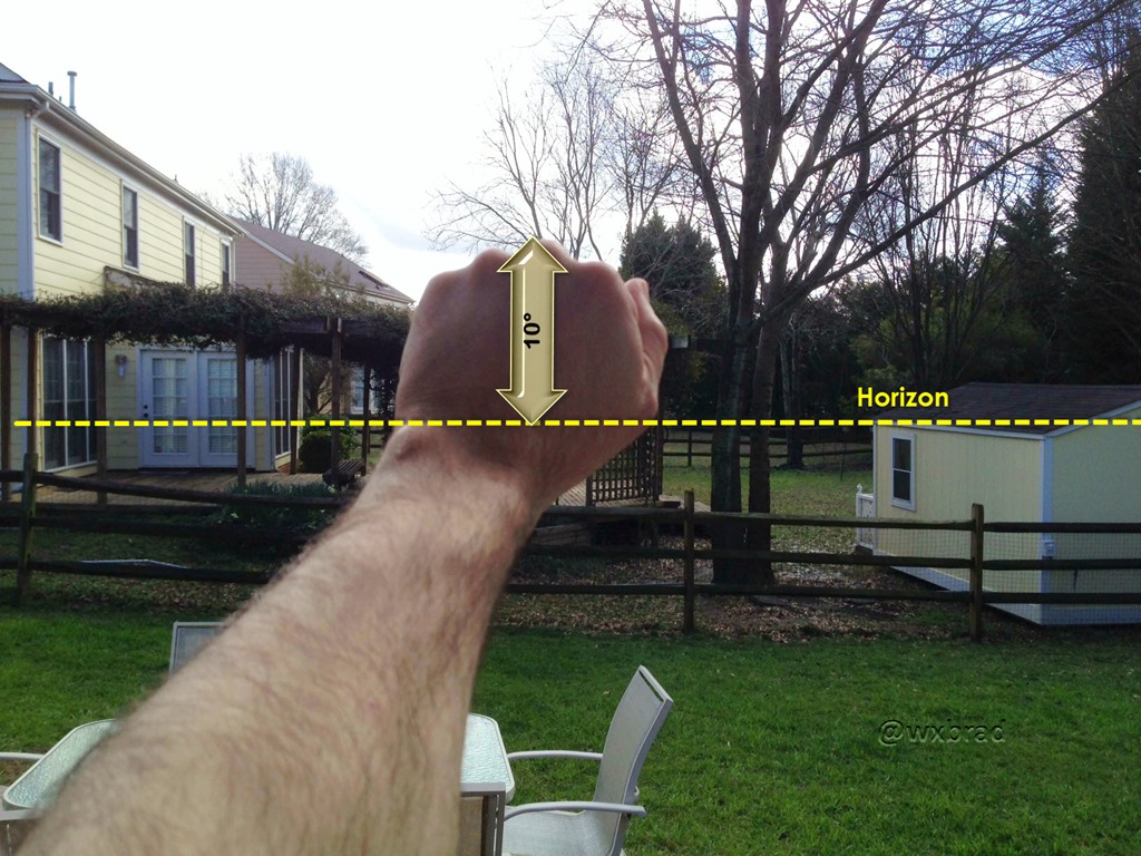Use a closed fist held at arm’s length from your body to gauge the distance above the horizon.