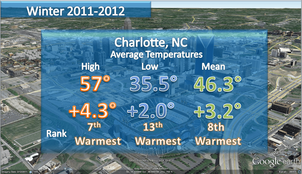 Which is very odd considering that while Charlotte will never be mistaken for Buffalo, NY we always get at least a little snow. We only average about 4.3” of snow over the past 30 years while our all-time average is 5.7”. Our records go back 134 years in Charlotte and in that 134 year history we have never had 0.00” of snow. Seems shocking I know, but even in the mildest of winters we have gotten at least a trace and even that has only happened 11 times in 134 years. The last time was 2005-2006 but even that year we had 3 days where we got a Trace of snow. We saw a trace 3 times that year once in November, January and February. So this winter has been amazing with not only the warm temperatures but the lack of even a trace of snow or ice.