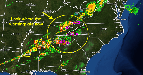 It was a long day and night of tracking the Tornado Outbreak to our Northwest and West Friday. I was sending out updates all day and night and around 11:35pm after the news I made note of this radar image seen below. It shows that all the cells heading into the Western Carolinas currently had tornado warnings with them. This didn’t mean that they would continue too, but that these cells would have had a history of procuring tornadoes warnings as they approached.