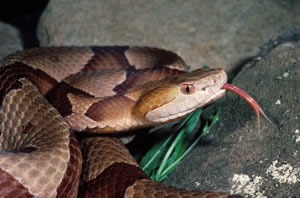 Which leads me to the most feared snake in the Carolinas which is the Copperhead below. Notice the distinctive large banding pattern and the cooper colored head where it gets it’s name. These are highly venomous with the baby Copperheads as the most poisonous. The juvenile Copperheads have very concentrated venom and have little control on how much they inject when they bit. So they tend to unload it all in one bite.